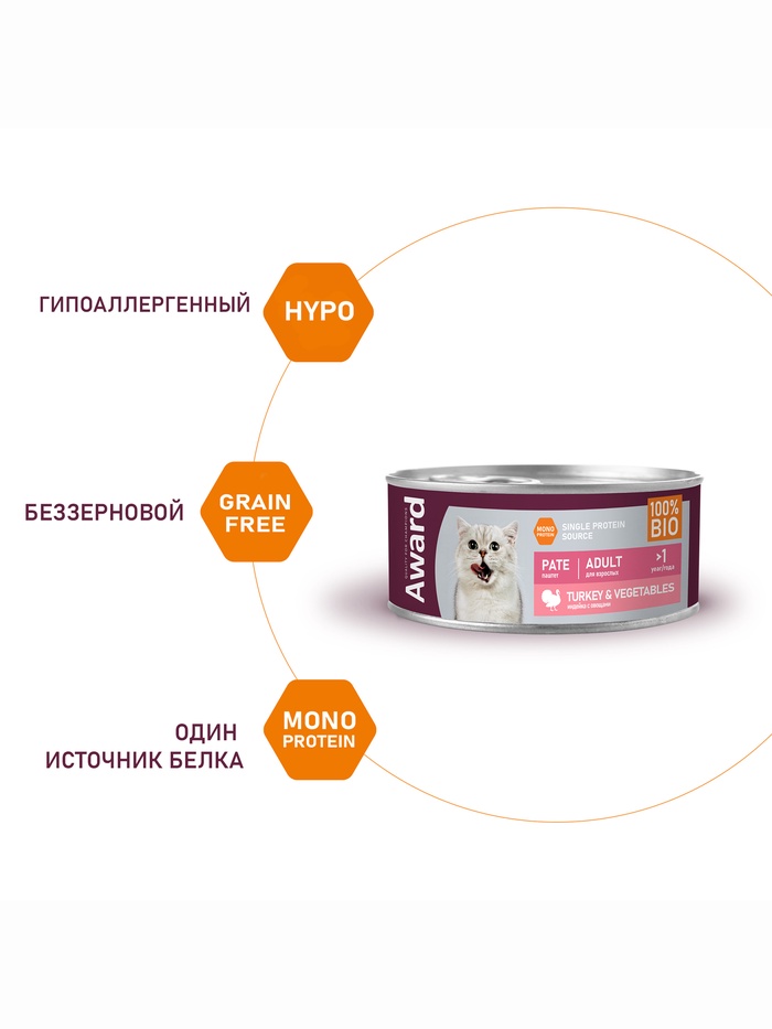 Влажный корм AWARD для взрослых кошек паштет из индейки с овощами 100 г