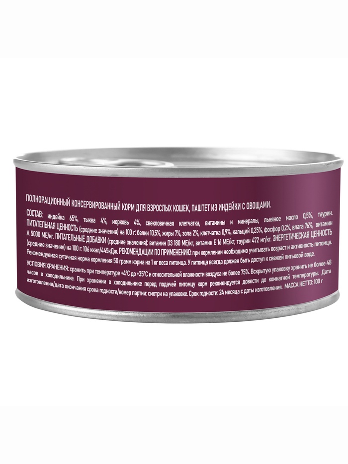 Ежедневный рацион с мясом и растительными компонентами. Паштет из индейки с овощами для взрослых кошек — влажный корм с однородной текстурой, разработанный для повседневного питания животных от 1 до 7 лет.