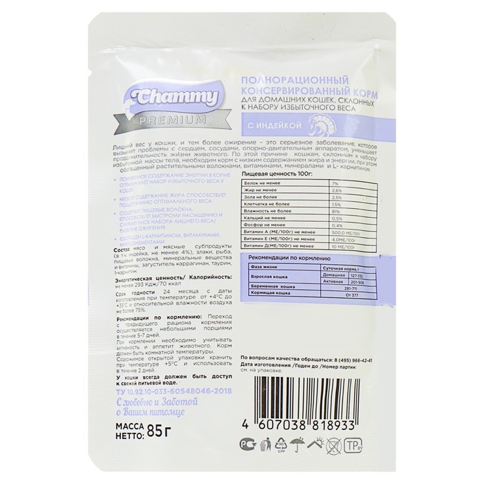 Влажный корм Chammy Premium для домашних кошек, склонных к полноте, индейка, 85 г