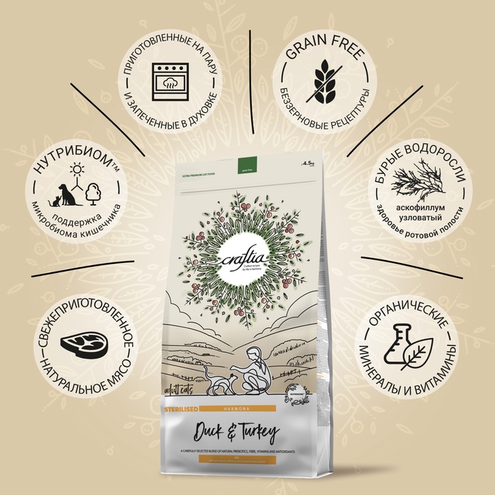 Сухой корм CRAFTIA HARMONA для стерилизованных кошек из утки и индейки 4.5 кг