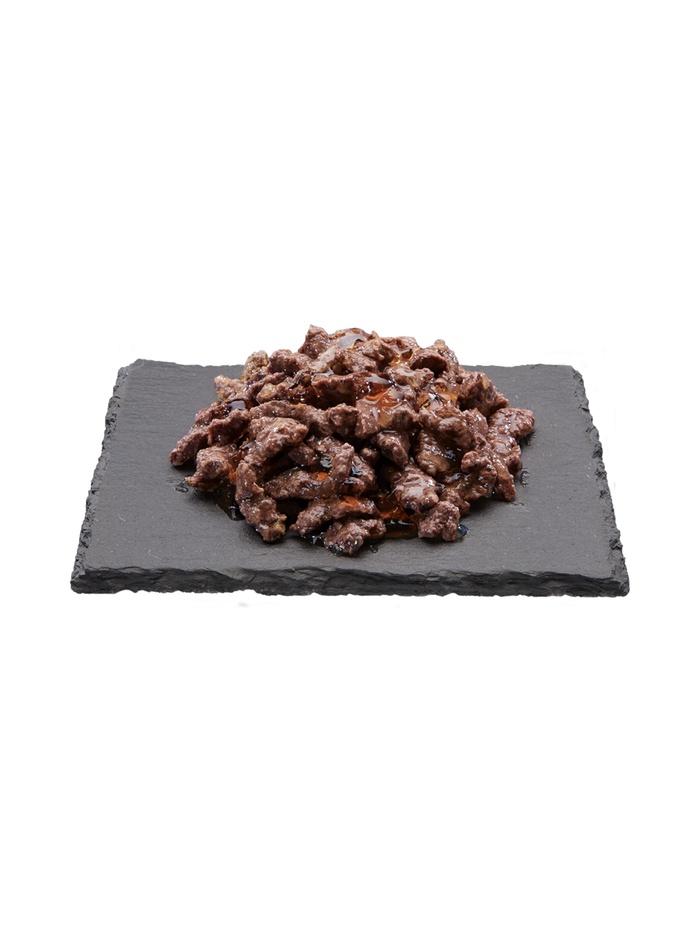 Мясные кусочки (мясо и субпродукты (в том числе говядина более 40 %, курица и индейка), минеральные вещества, витамины, мякоть сахарной свеклы) и желе (вода, загустители).