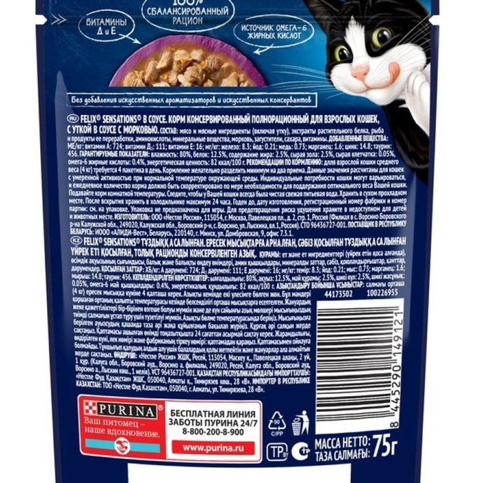 Влажный корм Felix Sensations для кошек, утка/морковь в соусе, пауч, 75 г