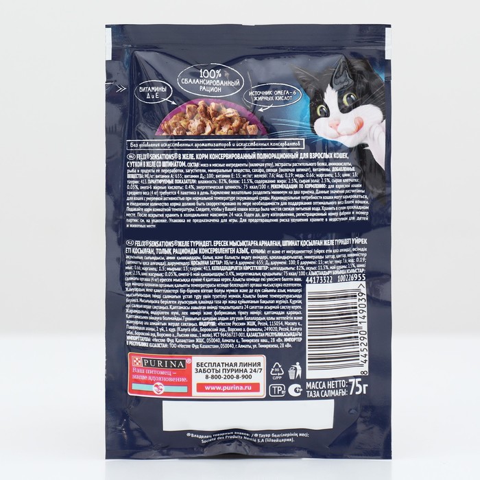 Влажный корм Felix Sensations для кошек, утка/шпинат в желе, 75 г