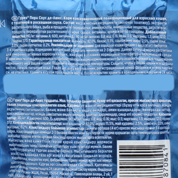Корм для взрослых питомцев «Перл Соус де-Люкс» — это тщательно отобранные нежные кусочки мини-филе с лососем, телятиной, говядиной или курицей в роскошном ароматном соусе с шелковистой текстурой. Корм для кошек от Гурмэ® полнорационный, содержит все необходимые для здоровья микронутриенты. Влажный корм с богатой вкусовой палитрой не оставит равнодушным Вашего пушистого гурмана.