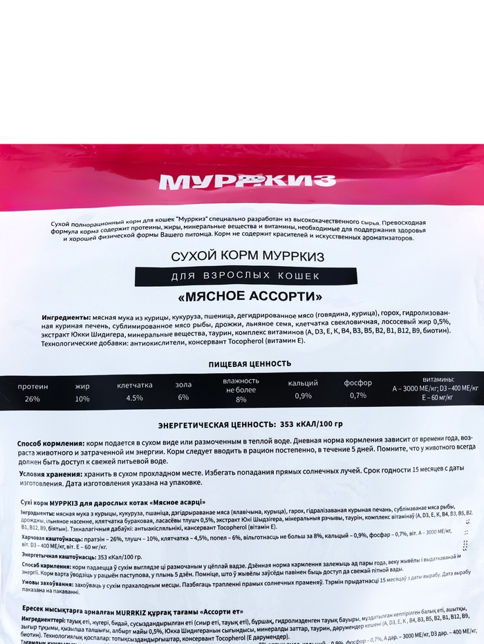 Сухой полнорационный корм для кошек “Мурркиз” специально разработан из высококачественного сырья. Превосходная формула корма содержит протеины, жиры, минеральные вещества и витамины, необходимые для поддержания здоровья и хорошей физической формы Вашего питомца. Корм не содержит красителей и искусственных ароматизаторов.