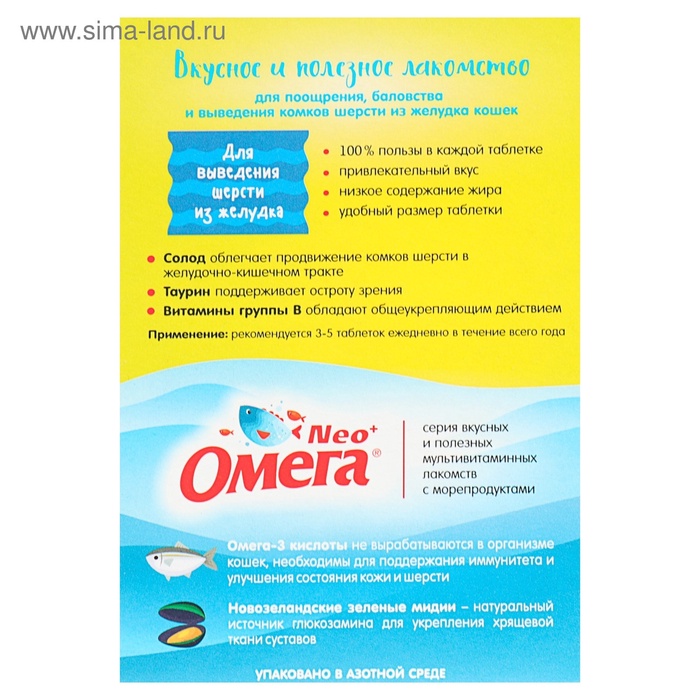 Лакомство Омега Neo+ «Для выведения шерсти из желудка» для кошек, с ржаным солодом, 90 табл