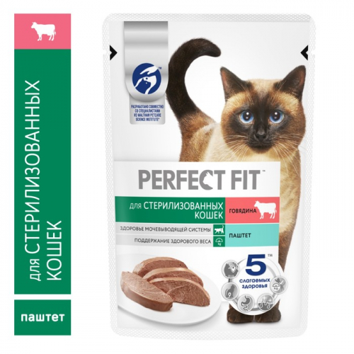 Влажный корм в паучах PERFECT FIT™ паштет с говядиной для стерилизованных кошек разработан по специальной рецептуре для контроля здоровья кошек, прошедших стерилизацию. Поддерживает здоровье мочевыводящей системы у стерилизованных кошек, подверженных повышенному риску развития мочекаменной болезни. Поддержание здорового веса: специальный ингредиент L-карнитин способствует сжиганию жиров, помогая поддерживать здоровый вес