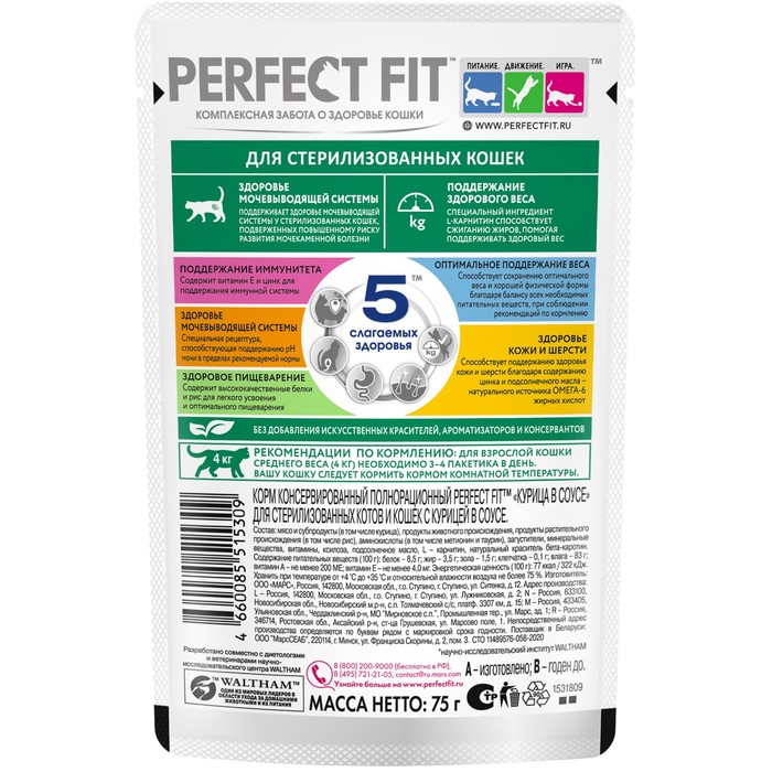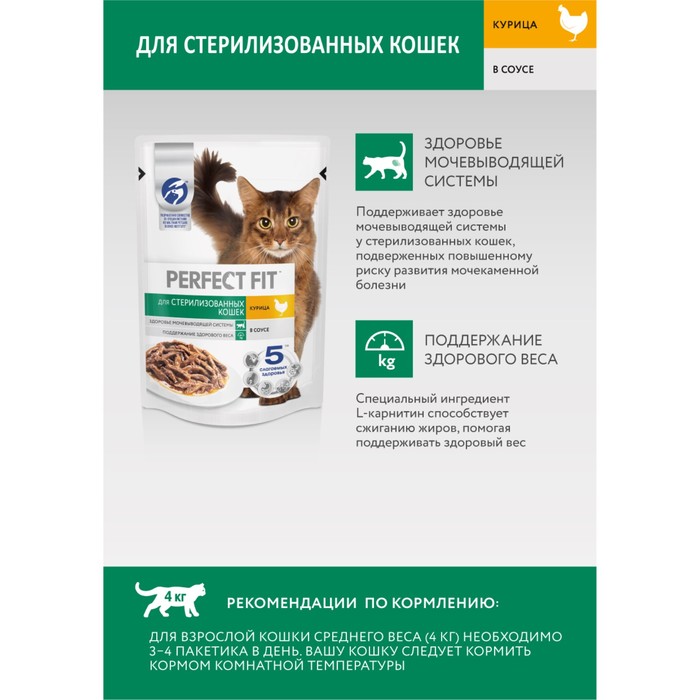 Влажный корм в паучах PERFECT FIT™ с курицей в соусе для стерилизованных кошек разработан по специальной рецептуре для контроля здоровья кошек, прошедших стерилизацию. Поддерживает здоровье мочевыводящей системы у стерилизованных кошек, подверженных повышенному риску развития мочекаменной болезни. Специальный ингредиент L-карнитин способствует сжиганию жиров, помогая поддерживать здоровый вес