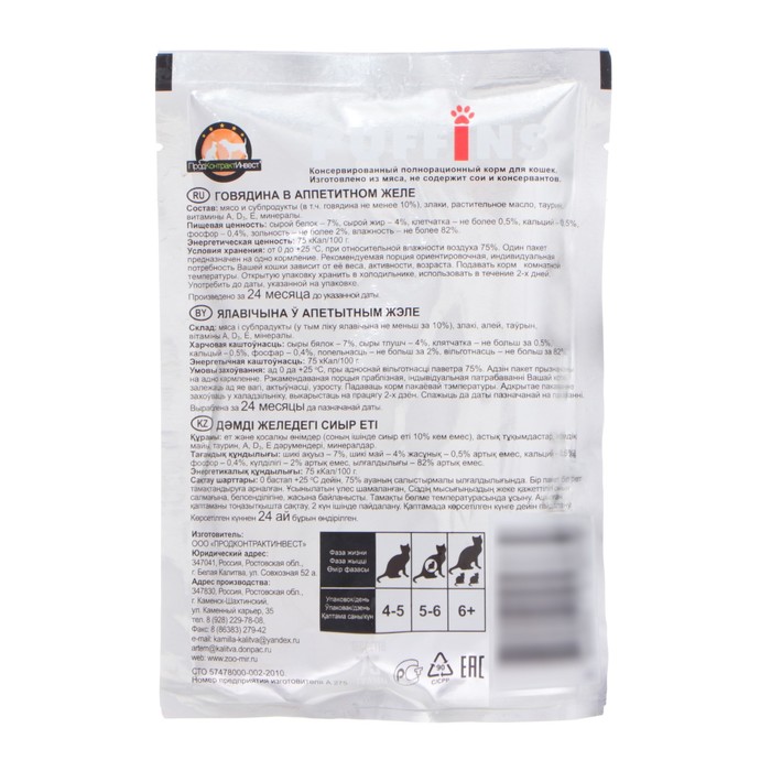 Влажный корм "Puffins" для кошек, говядина в желе, 75 г