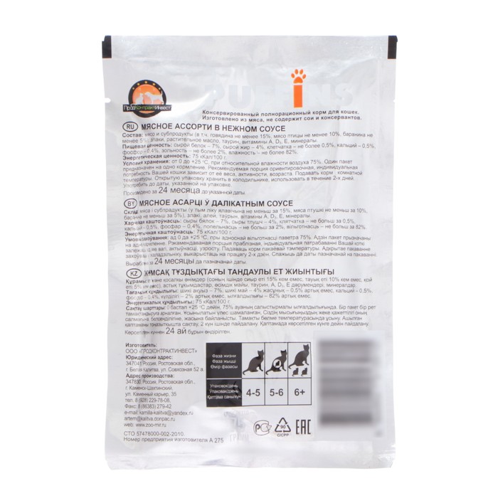 Влажный корм для кошек Puffins, мясное ассорти в соусе, 75 г