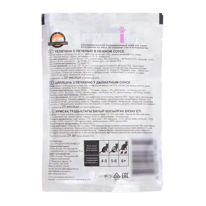 Сырьевой состав (на 100 г): мясо и субпродукты (в том числе телятина не менее 10%, печень не менее 4%), злаки, растительное масло, таурин, витамины А, D3, Е, минералы.