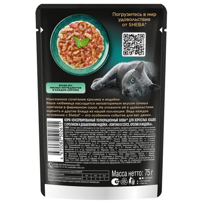 Влажный корм для кошек SHEBA с кроликом и добавлением индейки. «Ломтики в соусе. Кролик и Индейка», 75г
