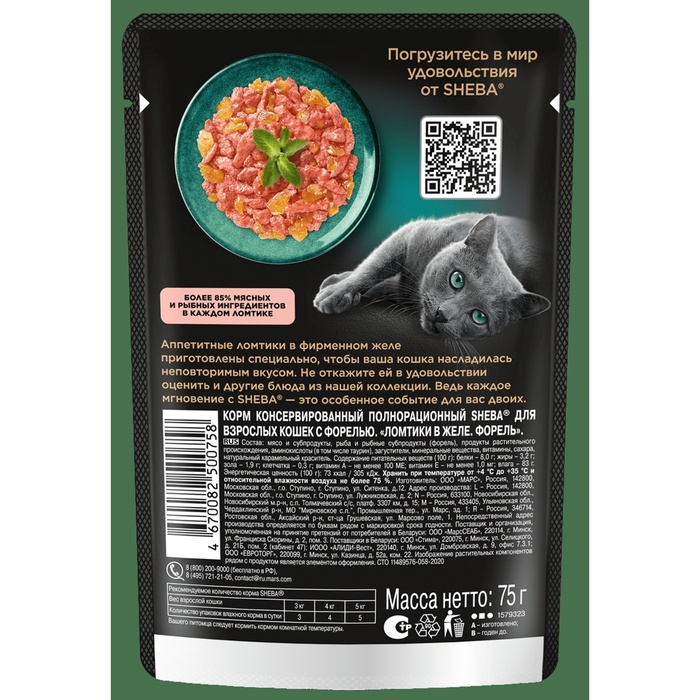 Влажный корм Sheba для взрослых кошек, форель, в желе, пауч, 75 г