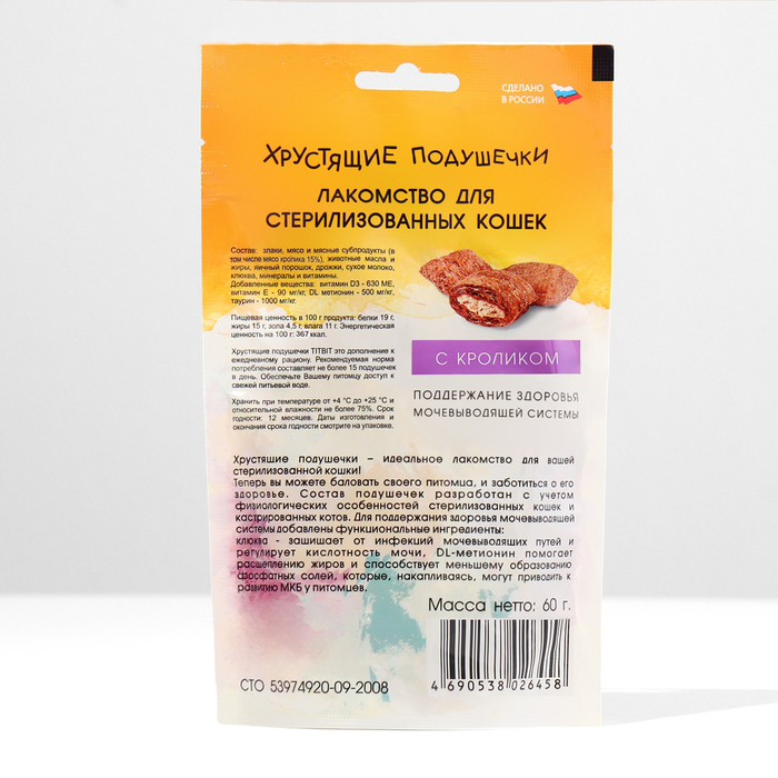 Хрустящие подушечки TitBit для стерилизованных кошек с кроликом, 60 г