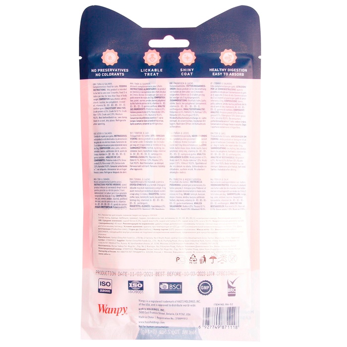 Wanpy Cat Лакомство для кошек «Нежное пюре» из тунца и лосося 70 г