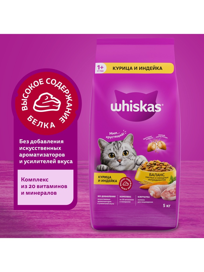 Сухой корм Whiskas для кошек, курица/индейка, подушечки, 5 кг