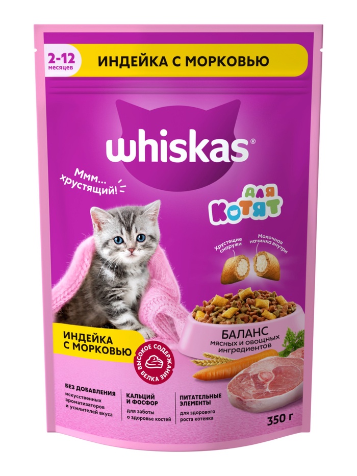 Сухой корм Whiskas для котят, индейка/морковь/молоко, подушечки, 350 г