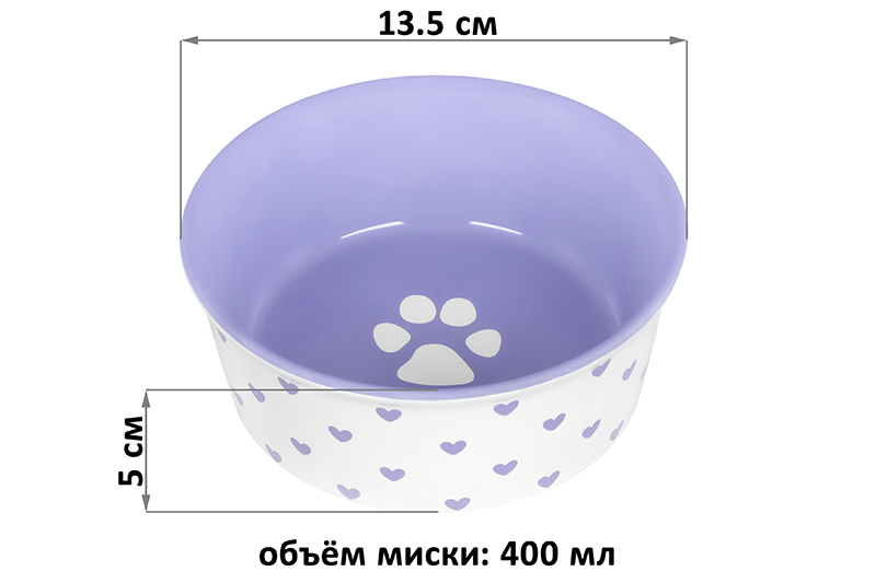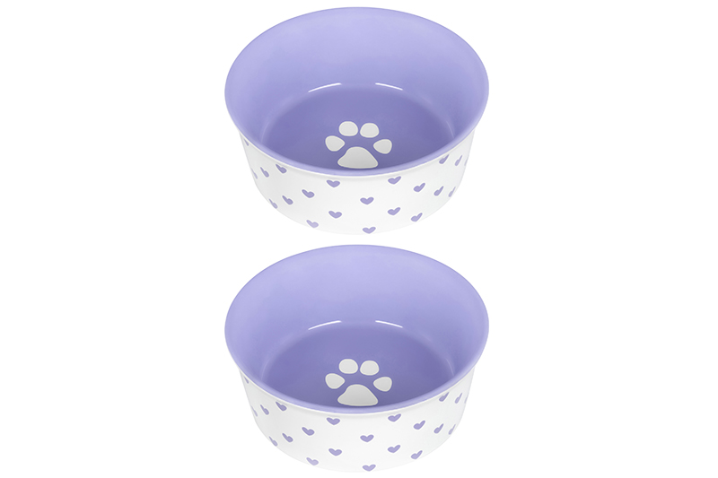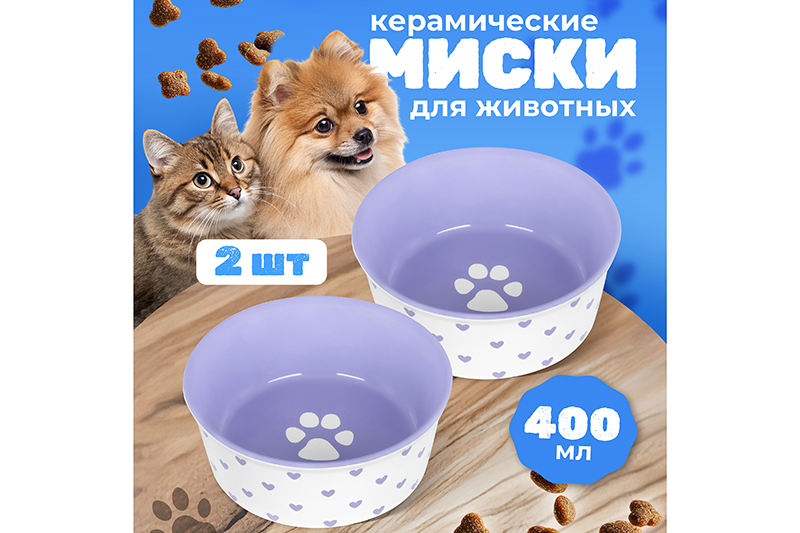 БЫЛО 783 руб! Набор мисок для домашних питомцев 2 пр. 400 мл 13,5*13,5*5 см "Лапка на сиреневом и сердечки" керами