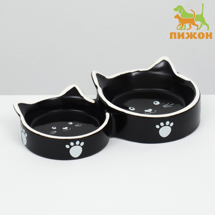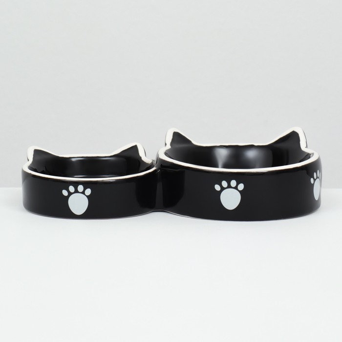 Миска для кошек Пижон «Кошачье семейство» 40/60 мл, 19×10.5×3.5 см, двойная, керамика, чёрная, белая