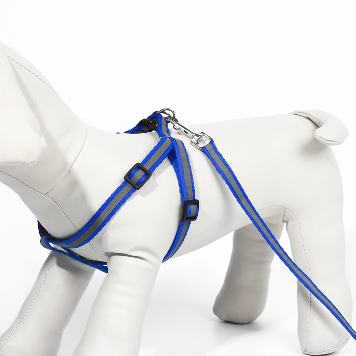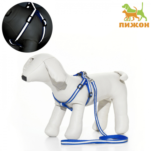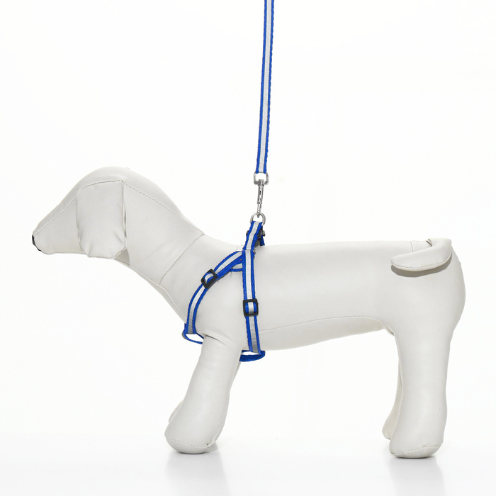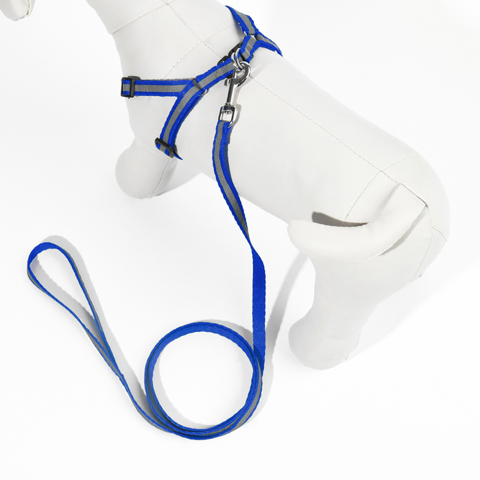 Комплект со светоотражающей лентой, ширина 1 см, поводок 120 см, шлейка 26-40 см, синий