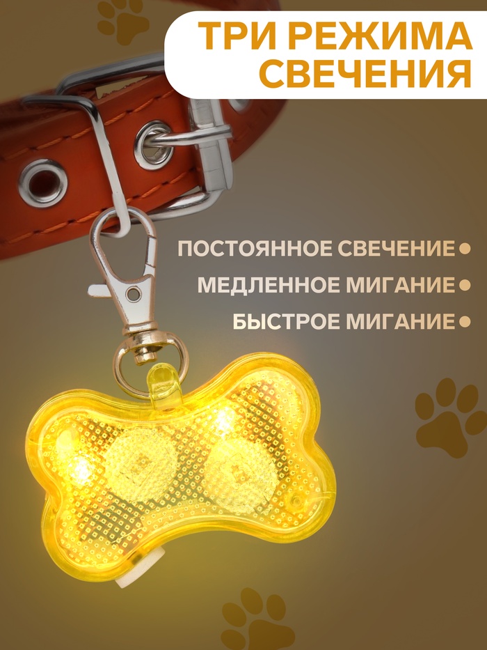 Светящийся адресник «Косточка» объединяет идентификатор с запиской и маячок с подсветкой. Фигурная форма и три режима свечения служит для обеспечения его безопасности и легкости обнаружения в темное время суток.