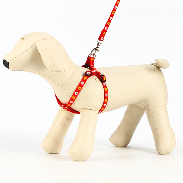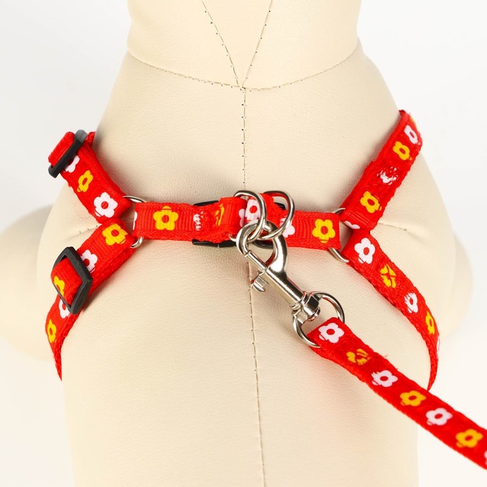 Шлейка с поводком «Цветы», ОГ 23-35 см, ширина 1 см, поводок 120 см, прошитая, красная