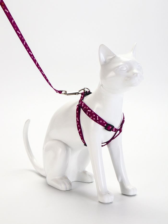 Комплект прогулочный включает в себя яркие шлейку и поводок, изготовленные из качественного капрона с использованием металлической и пластиковой фурнитуры.