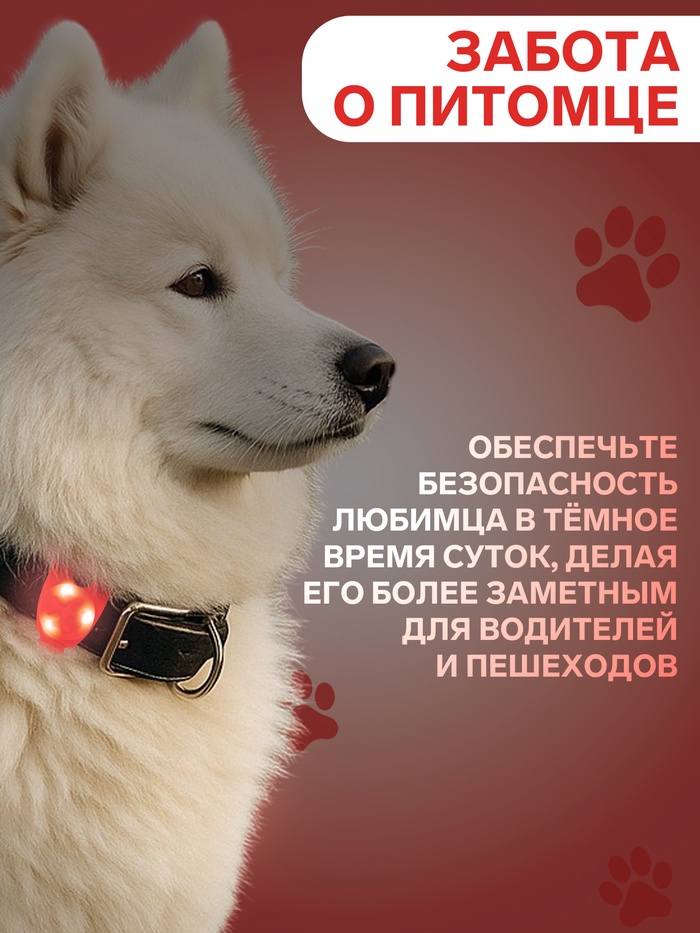 * Яркое свечение: Красный цвет светодиода обеспечивает отличную видимость в темноте, позволяя другим участникам движения заметить вашего питомца издалека.