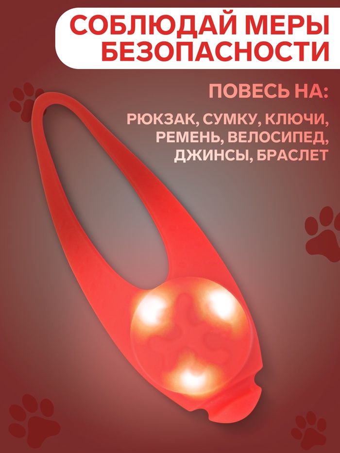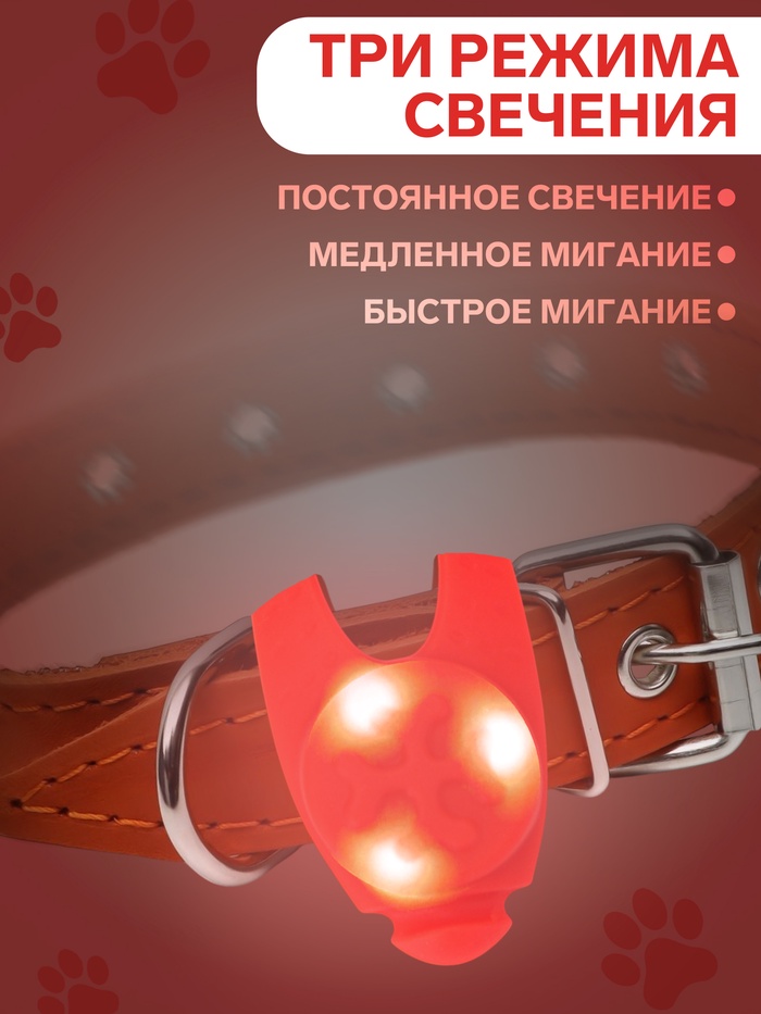 Световой маячок на ошейник/поводок «Лапка», 3 режима свечения, 3.2 см, силикон, красный