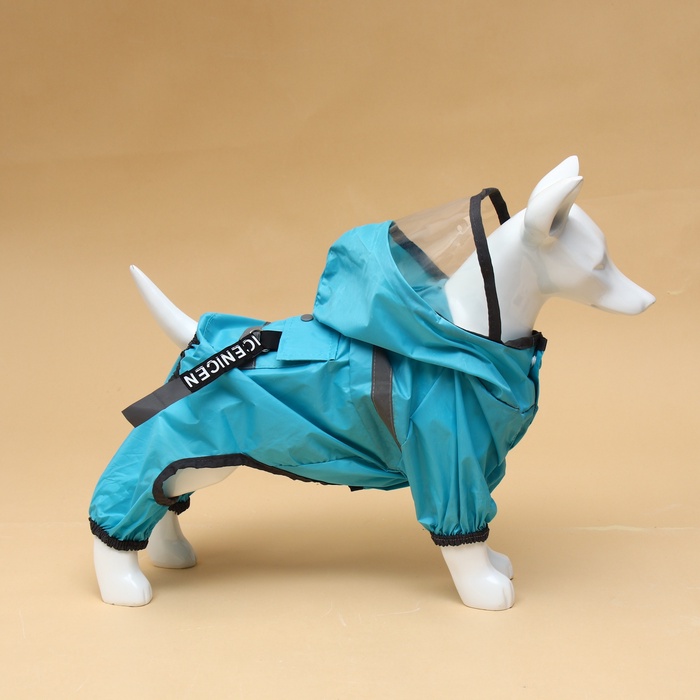 Комбинезон застегивается на кнопки, на лапах есть утягивающие резиночки, а на капюшоне есть прозрачный козырек, который защитит вашего питомца от ветра, пыли и дождя.