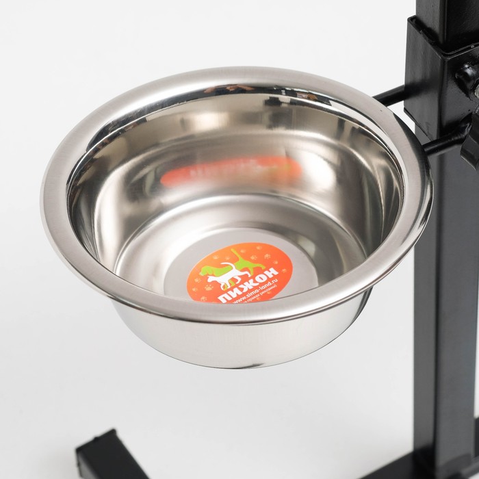 Стойка с 2-мя мисками для кормления сразу нескольких животных, это  – идеальное решение для кормления щенков и собак подростков, живущих на одной территории. Качественные, практичные и функциональные миски для собак размещены на регулируемой подставке, которая будет "расти" вместе с вашими малышами. Винтовая кормушка убережёт помещение от загрязнения кормом и водой. Металлическая конструкция очень устойчивая, поэтому ее очень сложно сдвинуть или опрокинуть даже самым активным щенкам. Стойка и миски хорошо переносят обработку горячей водой, моющими и дезинфицирующими средствами.