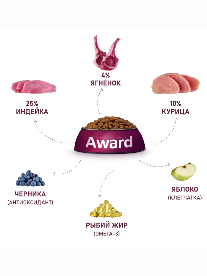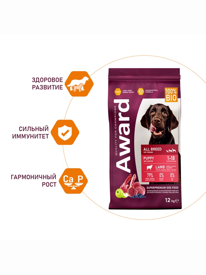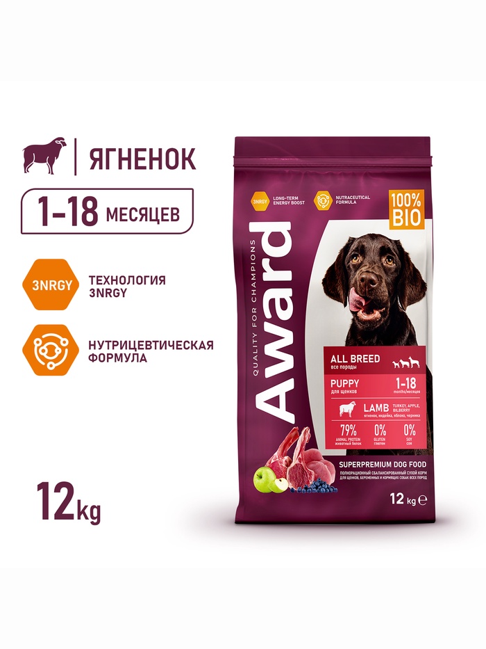 Сухой корм AWARD для щен. от 1 мес, бер-х и кор-х сук всех пород с ягн/инд/яблоко 12 кг