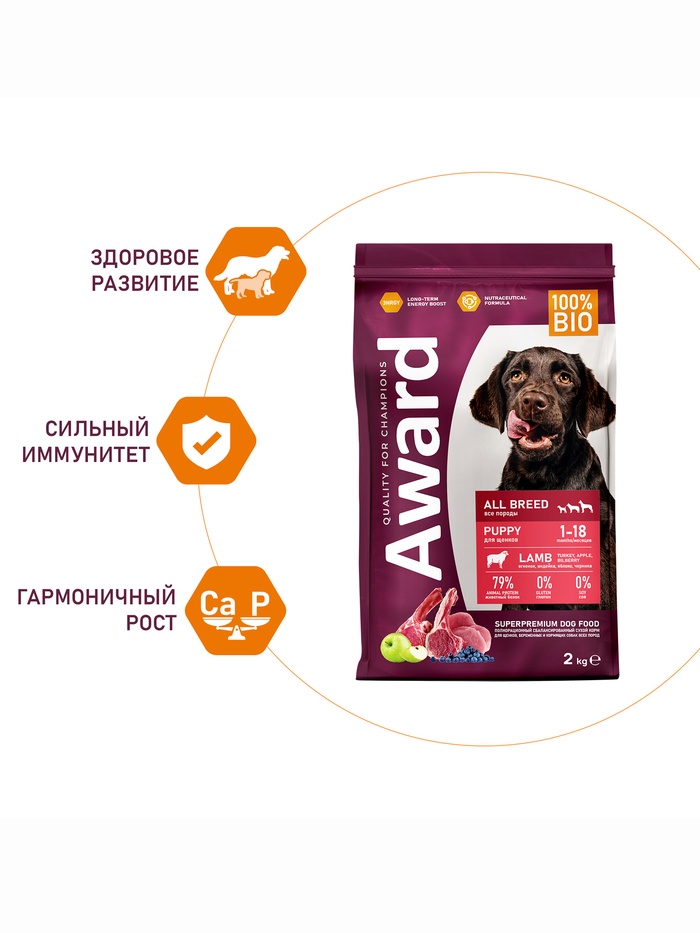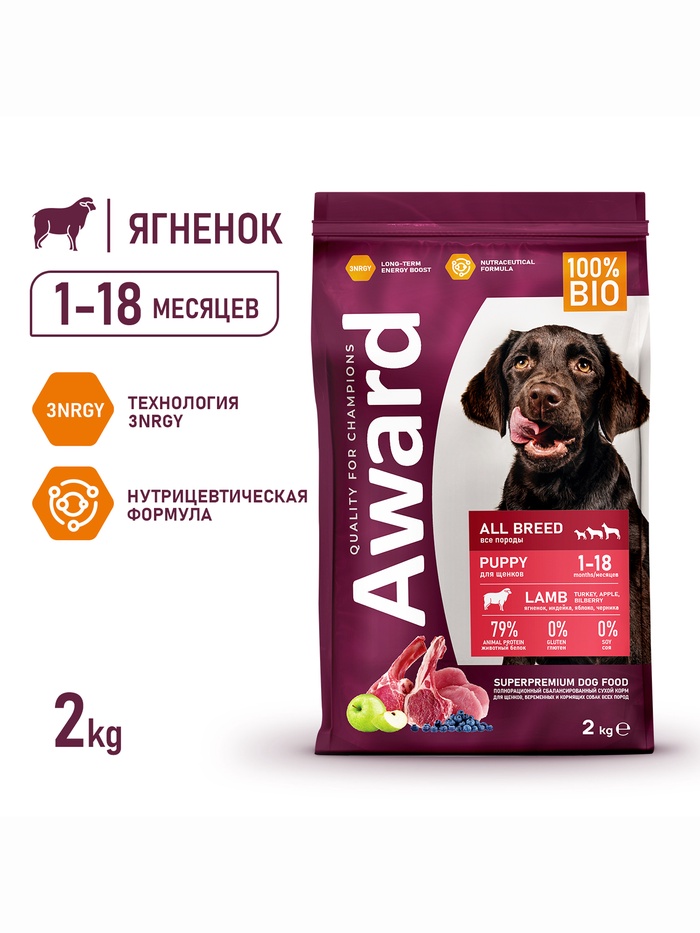 Сухой корм AWARD для щен. от 1 мес, бер-х и кор-х сук всех пород с ягн/инд/яблоко 2 кг