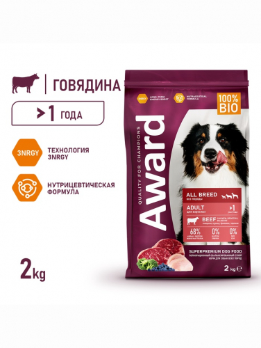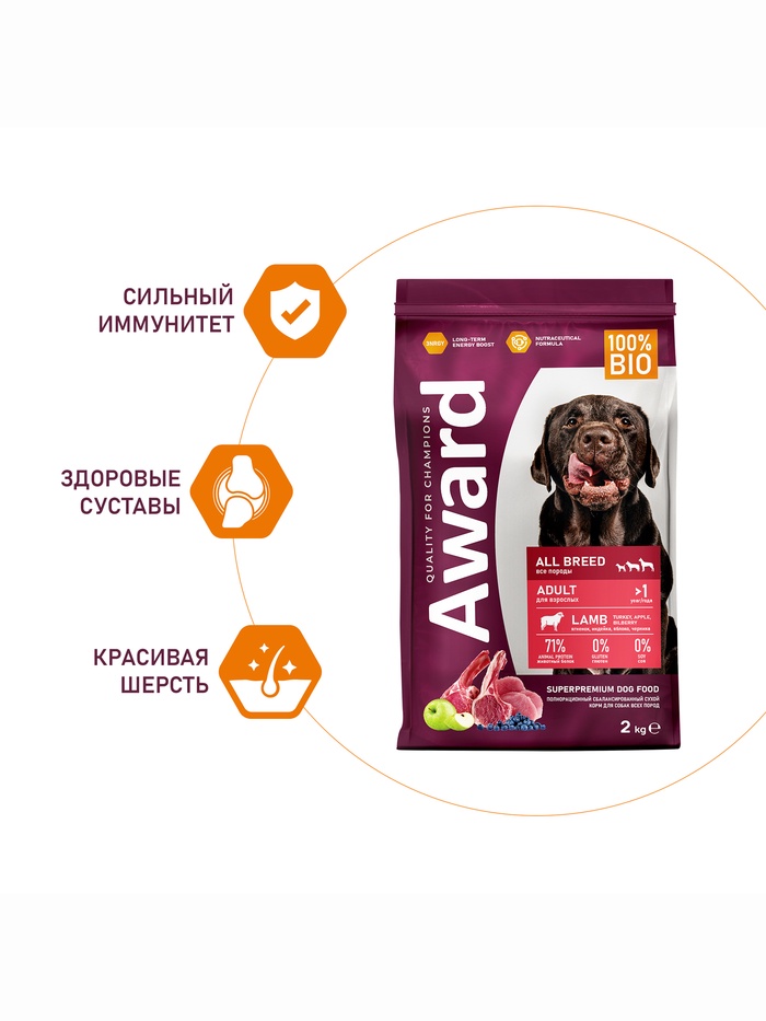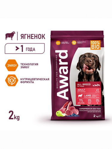 Сухой корм AWARD для вз-х собак всех пород с ягн/инд/добавлением яблока и черники 2 кг