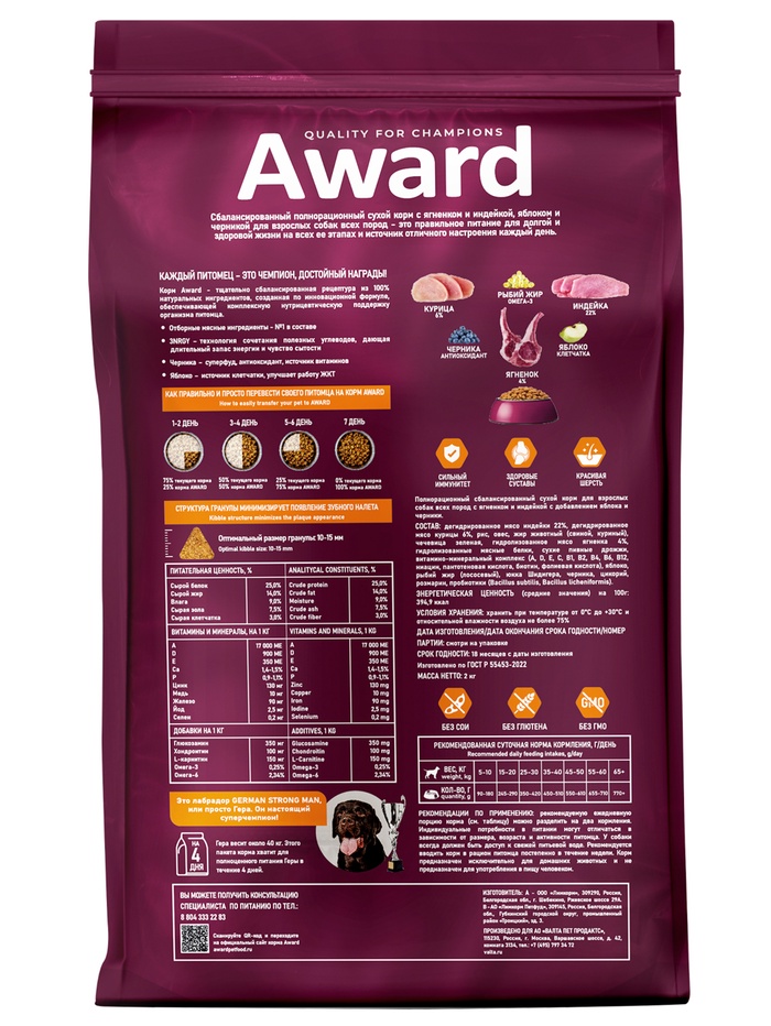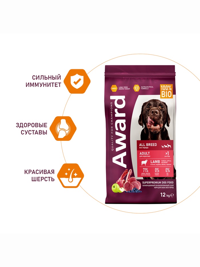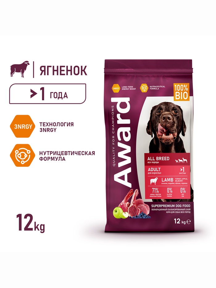 Сухой корм AWARD для взрослых собак всех пород, ягнёнок/индейка/яблоко/черника 12 кг