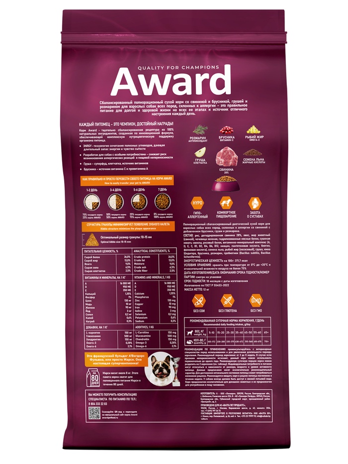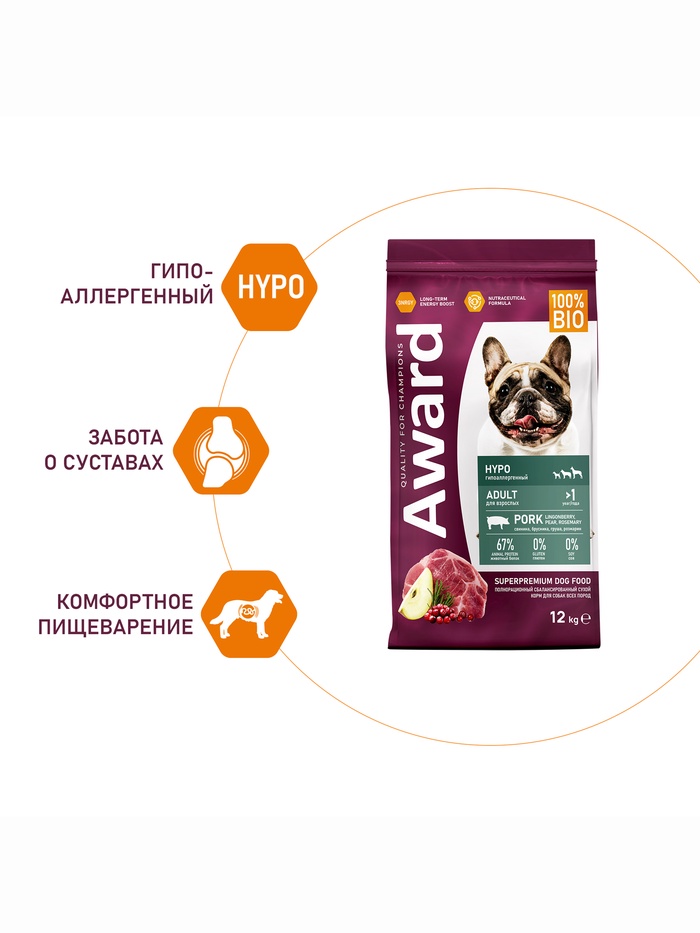 Сухой корм AWARD HYPO для вз-х собак всех пород свинина/брусника/груша и розмарин 12 кг