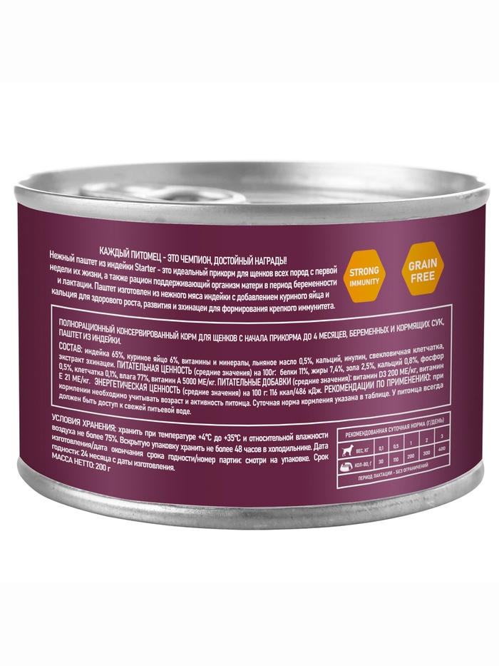 Забота о здоровье начинается с правильного питания. Влажный паштет из индейки для щенков до 4 месяцев и кормящих сук мелких пород — сбалансированный корм в банке 200 г для самых нежных этапов жизни собаки.