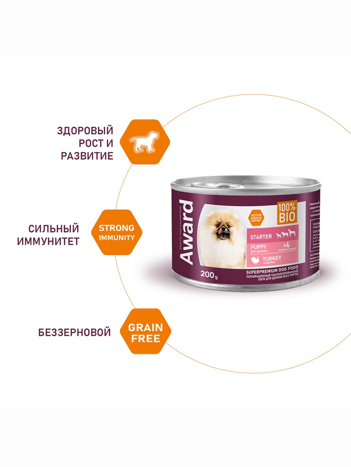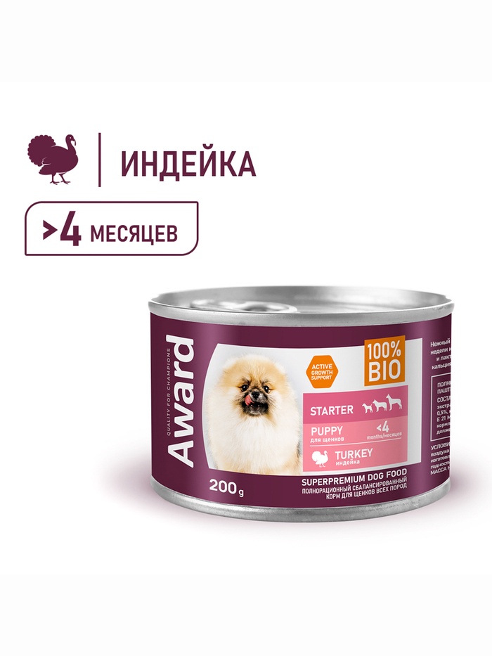 Влажный корм AWARD для щенков до 4 мес., беременных и кормящих сук паштет из индейки 200 г