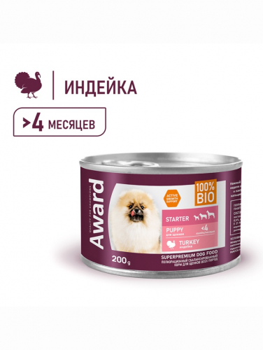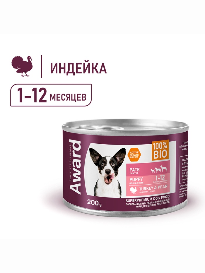 Влажный корм AWARD для щенков от 1 месяца паштет из индейки с грушей 200 г