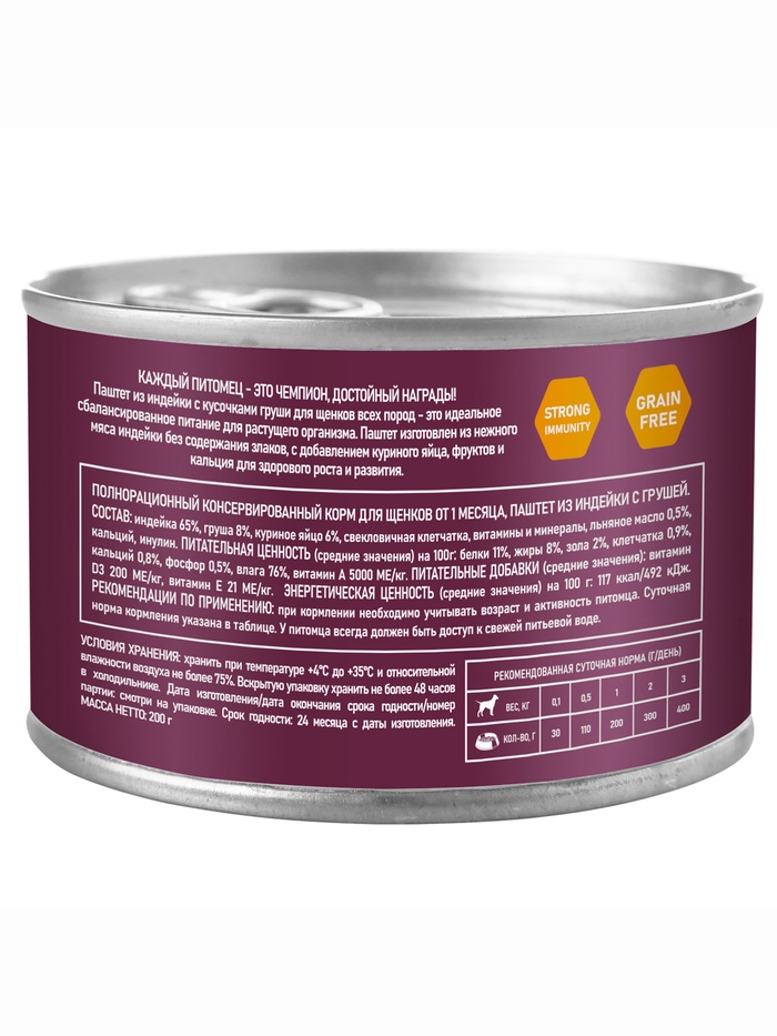 Забота о маленьком питомце начинается с правильного питания. Паштет из индейки с грушей для щенков мелких пород — влажный корм в банке 200 г, специально созданный для собак до года.