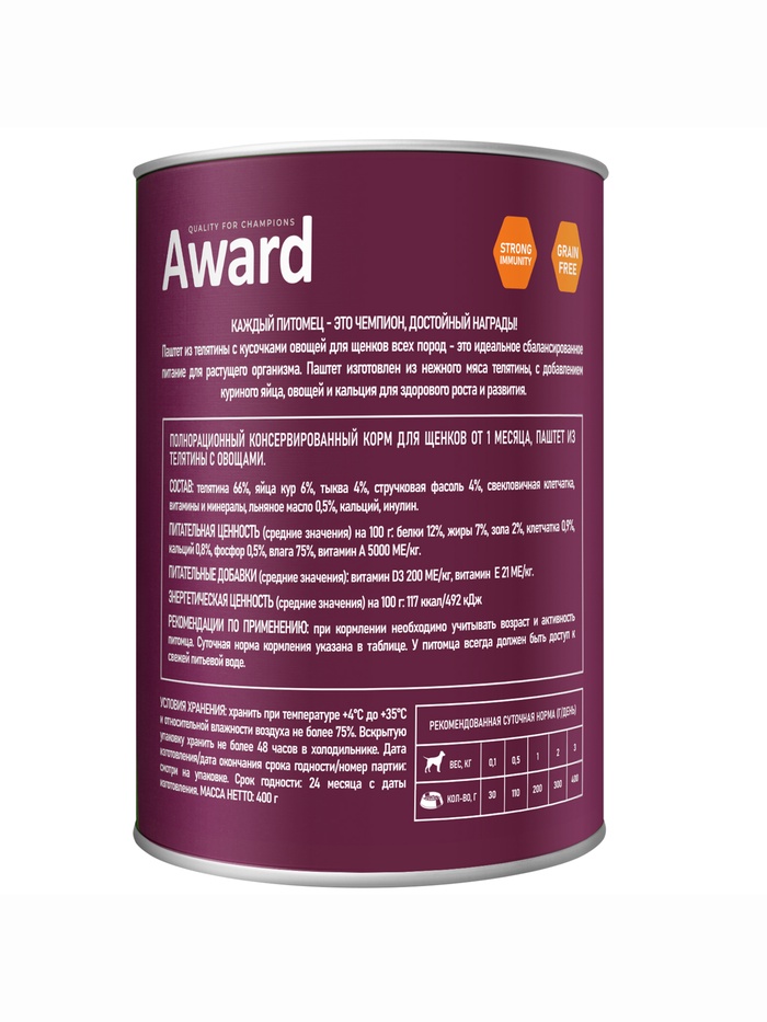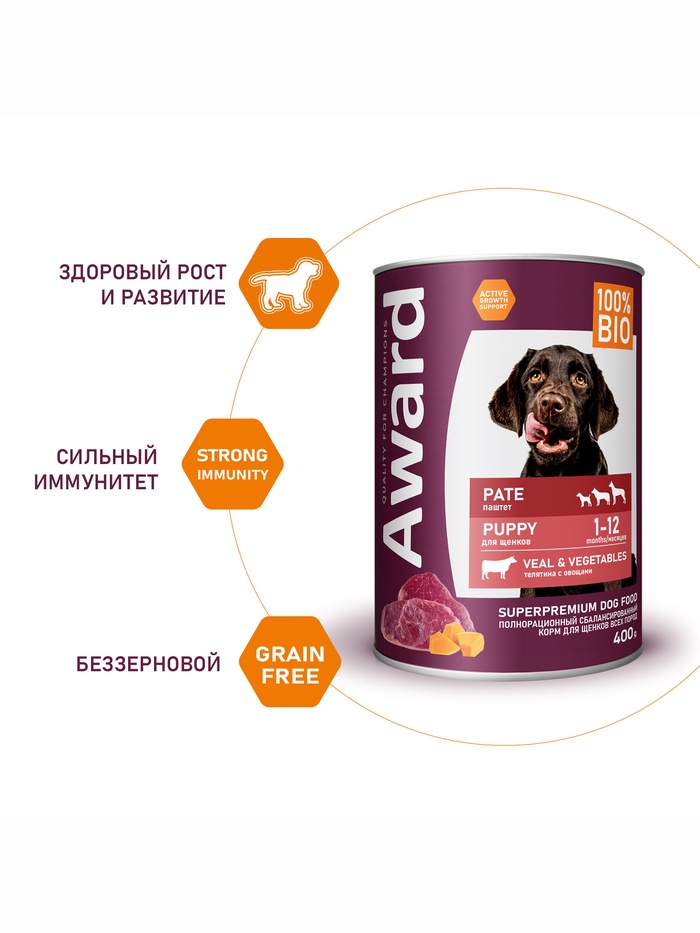 Влажный корм AWARD для щенков от 1 месяца паштет из телятины с овощами 400 г