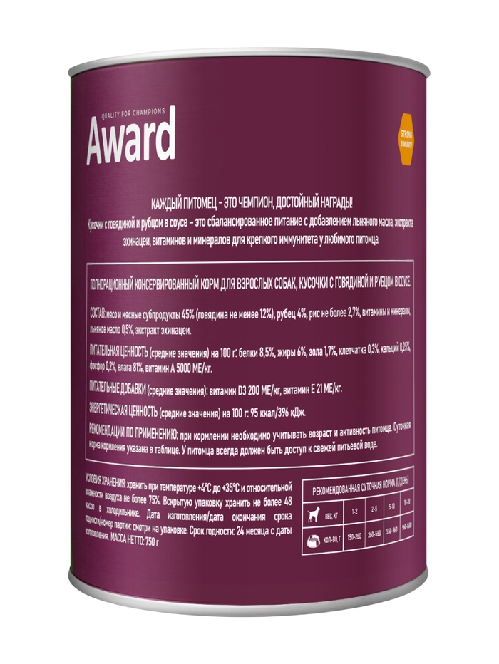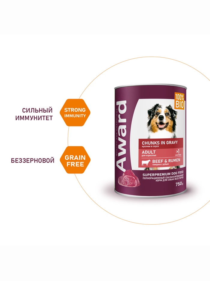 Влажный корм AWARD для взрослых собак кусочки с говядиной и рубец в соусе 750 г