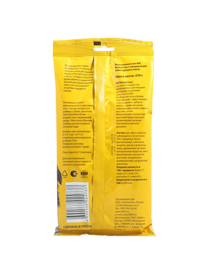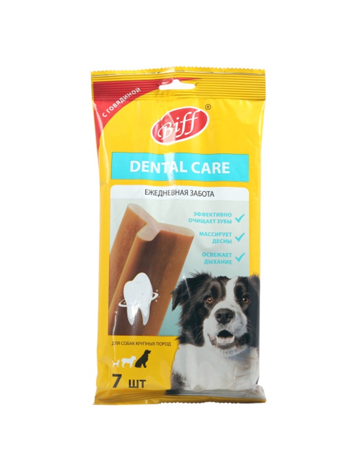 Biff Dental Care - это жевательный снек, необходимый для ежедневного ухода за ротовой полостью собак. Особая текстура и форма способствуют эффективному снятию мягкого зубного налета, снижению риска образования зубного камня и массажу десен. Фитокомплекс экстрактов растений предотвращает размножение вредных бактерий и освежает дыхание.
