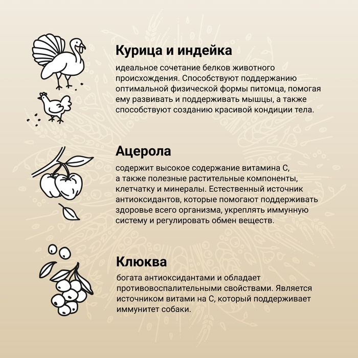 * Мясная основа: курица и индейка служат источником легкоусвояемого белка, поддерживающего развитие мышц и энергию.