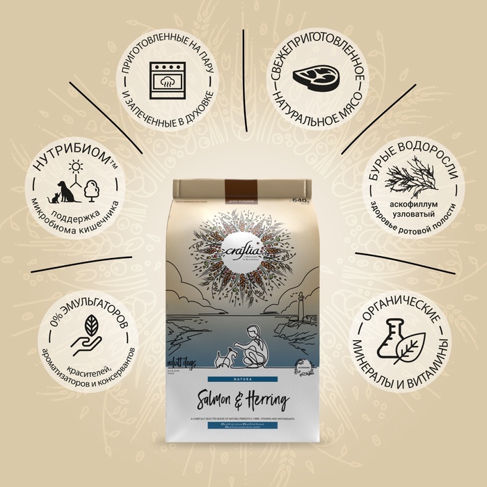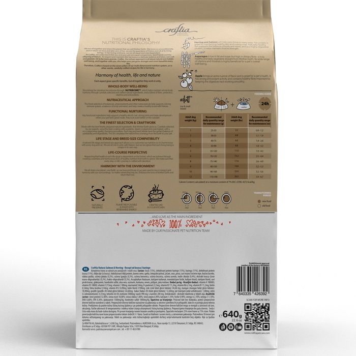 Сухой корм CRAFTIA NATURA для взрослых собак миниатюрных и мелких пород из лосося с сельдью 640 г