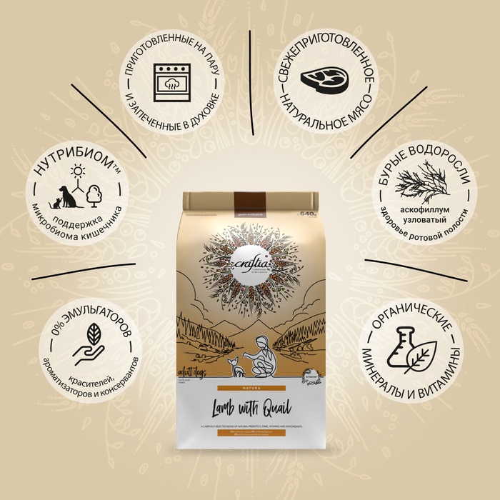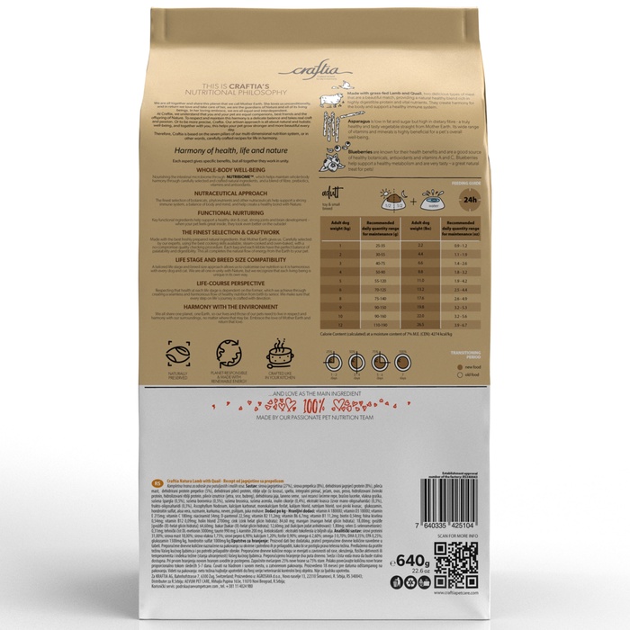Сухой корм CRAFTIA NATURA для взрослых собак миниатюрных и мелких пород из ягненка с перепелкой 640