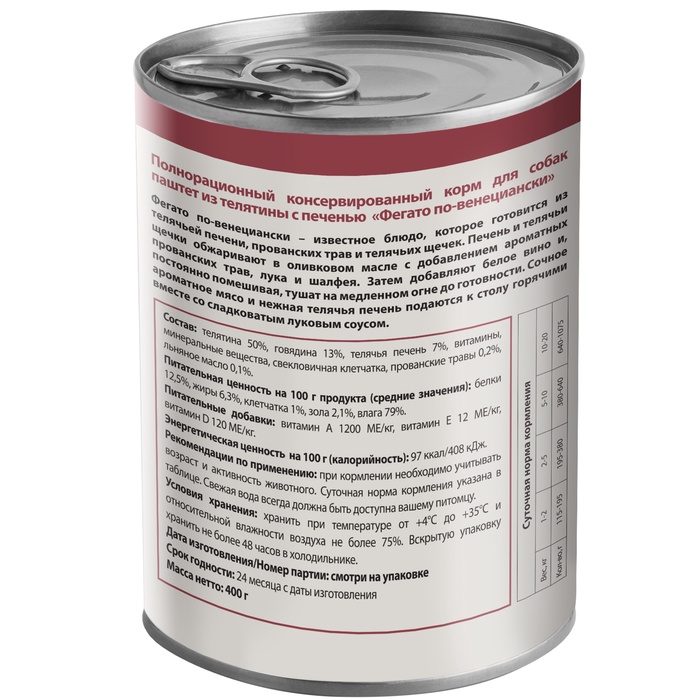 Когда аппетит требует чего-то насыщенного — но без лишнего. Влажный паштет для собак всех пород с телятиной и печенью — деликатес в жестяной банке 400 г. Создан как вкусовое дополнение к основному рациону для взрослых собак от 1 до 5 лет. Подходит всем породам — от чихуахуа до овчарки.