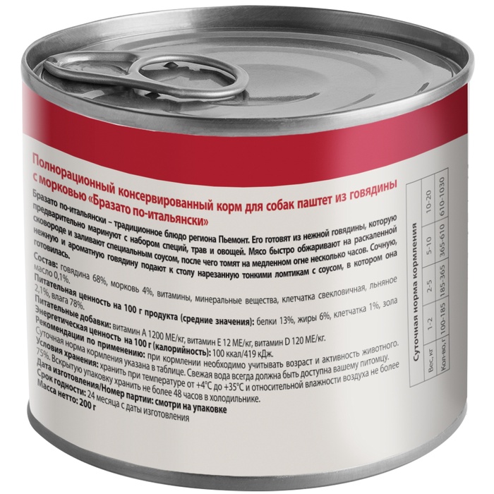 * Банка объёмом 200 г — одна порция: Подходит для одного кормления средней собаки. Жестяная упаковка сохраняет свежесть без консервантов и удобна в хранении — достаточно держать при температуре от +1 °C до +30 °C.
