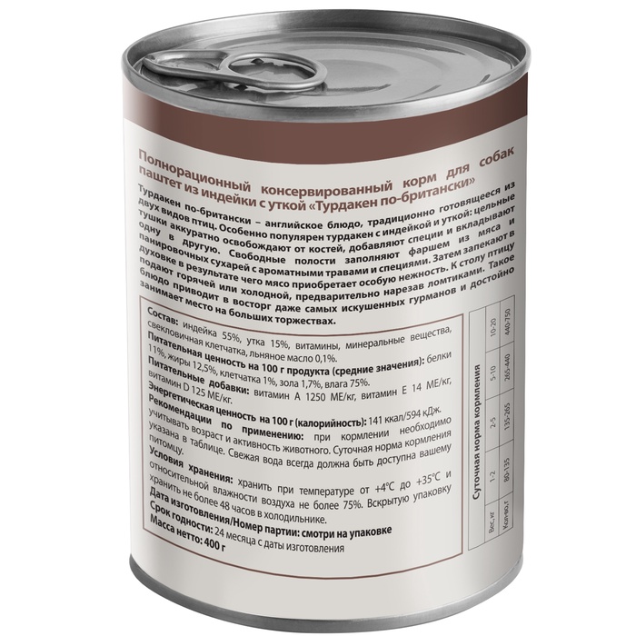 Когда обычного корма недостаточно — нужен вкус, который заставит вилять хвост. Влажный паштет для собак всех пород с индейкой и уткой — деликатес в жестяной банке 400 г. Разработан как насыщенное дополнение к основному рациону для взрослых собак от 1 до 5 лет. Подходит и мелким, и крупным породам — универсально по размеру, удобно по формату.