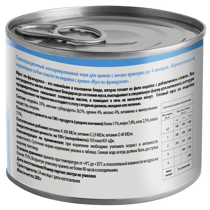 Первый вкус взрослой еды — должен быть мягким, как пух. Влажный паштет для щенков мелких пород с индейкой и цукини — деликатес в жестяной банке 200 г, созданный специально для щенков до 4 месяцев. Подходит маленьким породам — от чихуахуа до йоркширского терьера.
